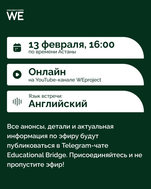Эфир пройдет 13 февраля, в 16:00 по времени Астаны на YouTube-канале WEproject.