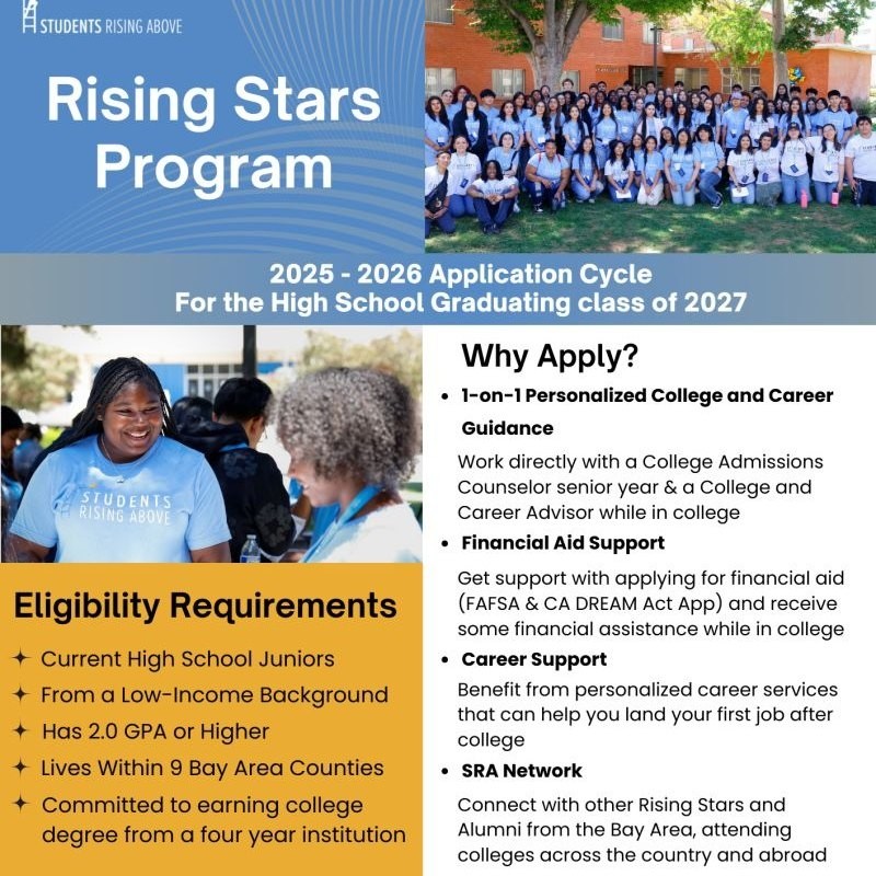 Are you ready to rise above barriers and pursue your college dreams? The Students Rising Above Rising Stars Program is here to support YOU with mentorship, financial assistance, and career guidance.