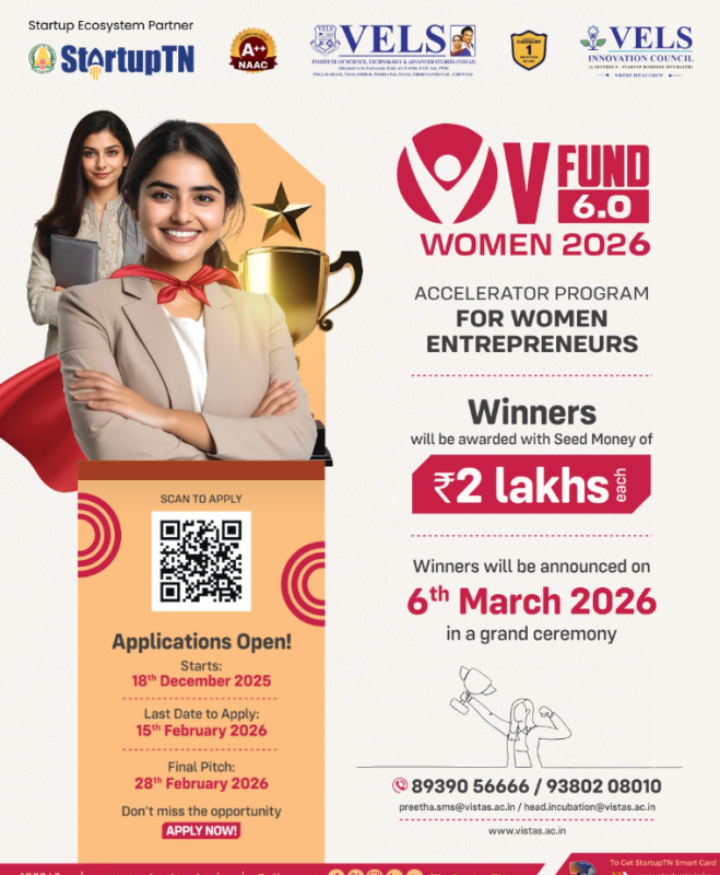 VELS Innovation Council invites applications for V-FUND 6.0, an accelerator program designed to support and scale women-led startup ideas. StartupTN is the Startup Ecosystem Partner for this initiative.