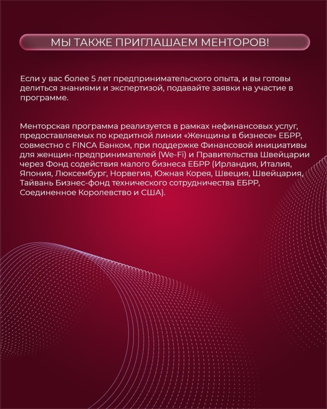 🖌️Программа наставничества реализуется в рамках нефинансовых услуг, предоставляемых по кредитной линии ЕБРД «Женщины в бизнесе», в партнерстве с FINCA Bank, при поддержке Инициативы по финансированию женщин-предпринимателей (We-Fi) и правительства Швейцарии через Фонд поддержки малого бизнеса ЕБРД (Ирландия, Италия, Япония, Люксембург, Норвегия, Южная Корея, Швеция, Швейцария, Техническое сотрудничество в рамках Бизнес-фонда ЕБРД, Великобритания и США).