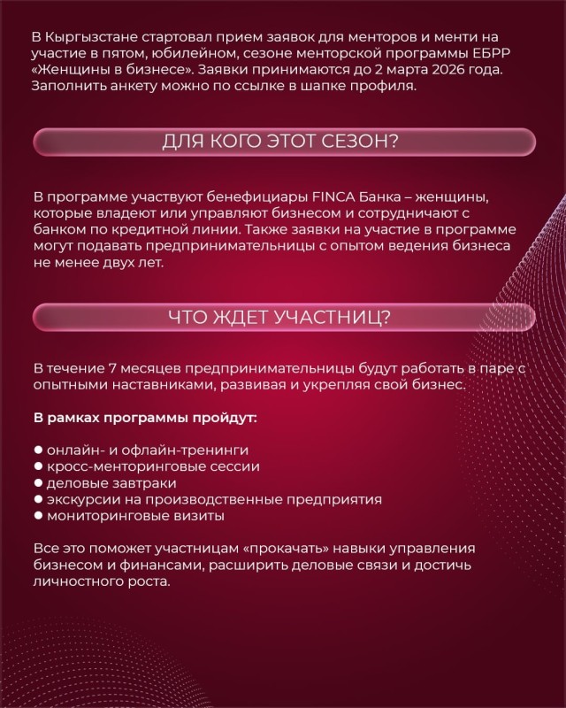 🙎🏻♀️Кыргызстанда ЕРӨБдүн «Бизнестеги айымдар» насаатчылык программасынын бешинчи, мааракелик сезонуна насаатчы жана шакирттердин арыздарын кабыл алуу башталды. Арыздар 2026-жылдын 2-мартына чейин кабыл алынат.