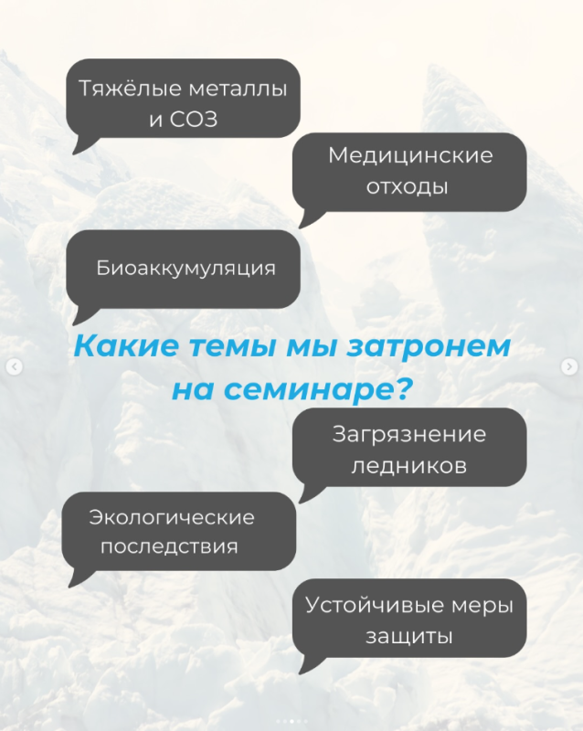 Участие в семинаре позволит получить актуальные знания о токсичных и органических отходах, проблеме загрязнения ледников и практических мерах по сохранению экосистем и водных ресурсов, а также окажется полезным для учебной, научной и проектной деятельности.