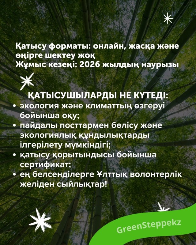 🌱 Егер саған экология тақырыбы жақын болса, онлайн-волонтер ретінде дағдыларыңды дамытқың келсе және тұрақты болашаққа үлес қосқың келсе — қосыл!