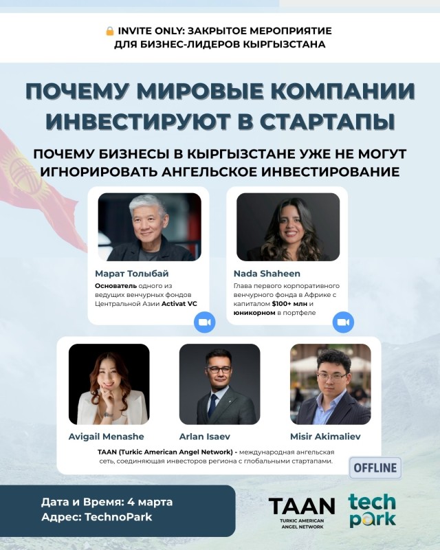 В рамках вечера будет представлено видение Turkic American Angel Network и шаги по включению Кыргызстана в глобальную сеть инвесторов.