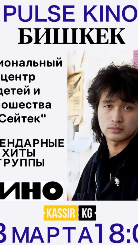 Приглашаем Вас на концерт песен Виктора Цоя, в исполнении группы Pulse Kino , который пройдет 28 марта в Национальном центре детей и юношества "Сейтек" по адресу ул. Абдумомунова 197, начало в 18:00.