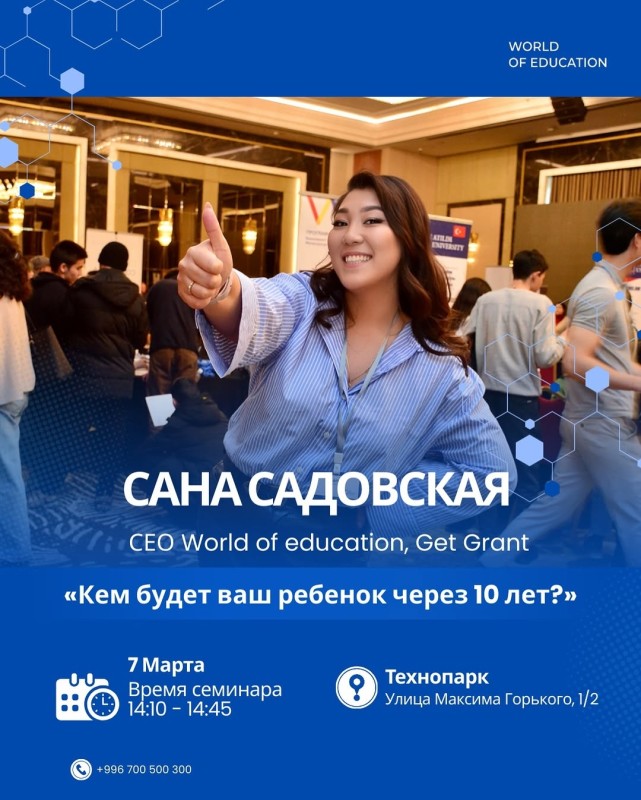 В рамках выставки состоится семинар от спикера Сана Садовская — СЕО World of Education и Get Grant.