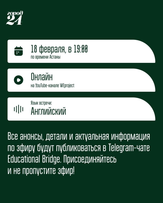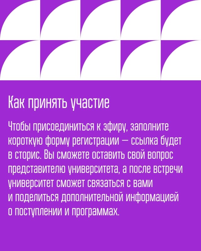 Чтобы присоединиться к эфиру, заполните короткую форму регистрации — ссылка будет в сторис. Вы сможете оставить свой вопрос представителю университета, а после встречи университет сможет связаться с вами и поделиться дополнительной информацией о поступлении и программах.