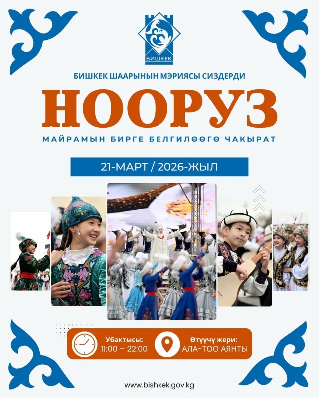 Дорогие жители и гости столицы! Мэрия города Бишкек приглашает вас вместе отметить один из самых светлых и долгожданных праздников — Нооруз.