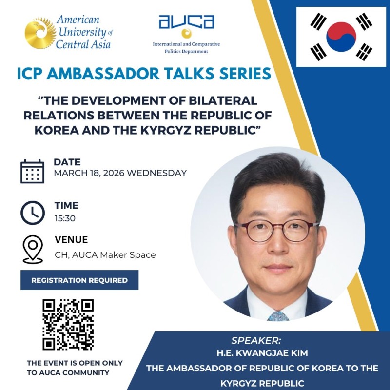 Кафедра международной и сравнительной политики приглашает вас на встречу с послом Республики Корея в Кыргызской Республике Ким Кванджае, которая состоится 18 марта в 15:30 в CH, AUCA Maker Space.