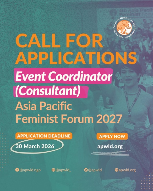 APWLD is looking for an Event Coordinator for the Asia Pacific Feminist Forum 2027 (APFF), one of the region’s largest gatherings of feminist movements. 🌸 The consultant will support the organisation and coordination of APFF, working closely with our team and partners across the region.