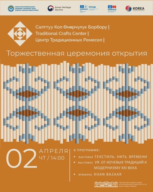 2-апрель Гапар Айтиев атындагы Кыргыз улуттук көркөм сүрөт музей базасында Салттуу кол өнөрчүлүк борборунун салтанаттуу ачылыш аземи өтөт. Иш-чара Корея Республикасы менен Кыргыз Республикасынын ортосундагы өнүктүрүү жардам долбоорунун алкагында өткөрүлөт: «Кыргыз Республикасында салттуу кол өнөрчүлүк буюмдарын өндүрүү жана алардын санариптик маркетинг дараметин жогорулатуу аркылуу маданий туризмди өнүктүрүү» (2023–2026).