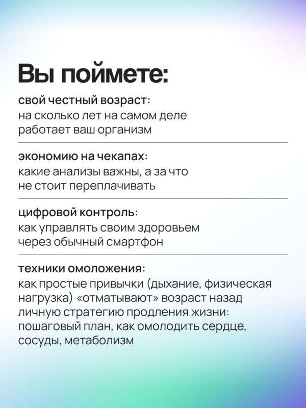 Вы научитесь понимать реальный возраст своего организма, разбираться в анализах, контролировать ключевые показатели и выстраивать систему, которая помогает сохранять энергию, ясный ум и физическую форму.