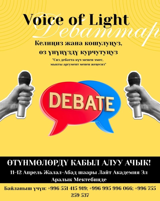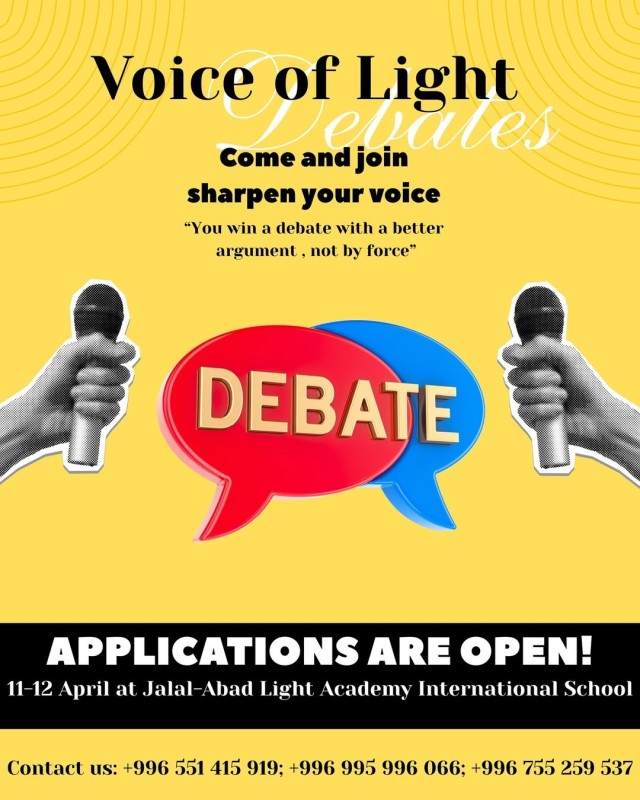 Манас шаарындагы Light Academy мектебинде масштабдуу дебат турнири өтөт. Өз пикириңди коргоп, мыктылар менен күч сынаш!