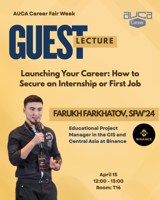 В рамках Недели ярмарок вакансий AUCA мы приглашаем вас на предстоящую гостевую лекцию, предназначенную для студентов, готовящихся к выходу на профессиональный уровень.