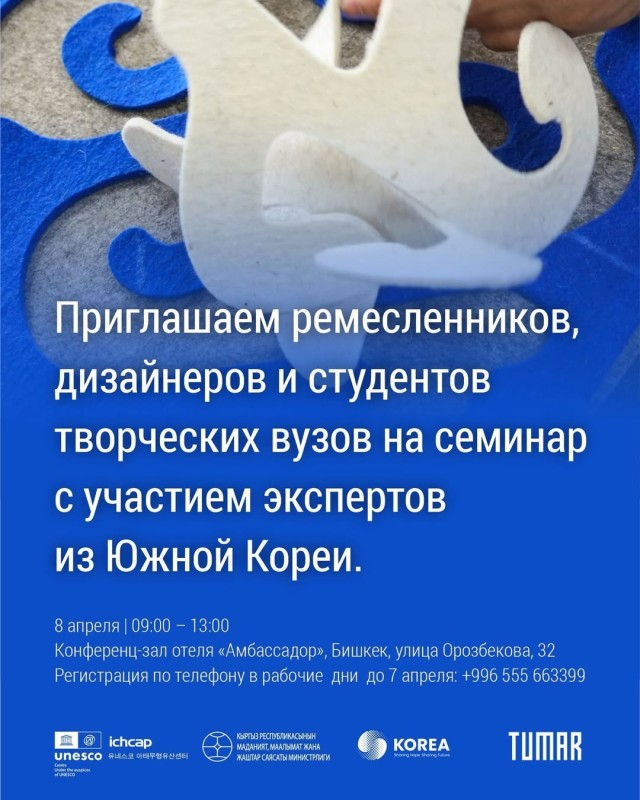 Семинар проводится в рамках проекта ЮНЕСКО (ICHCAP) в сотрудничестве с Министерством культуры, спорта и молодежной политики Кыргызской Республики по развитию культурных туристических продуктов, созданных на основе традиционных ремесел в Кыргызской Республике.