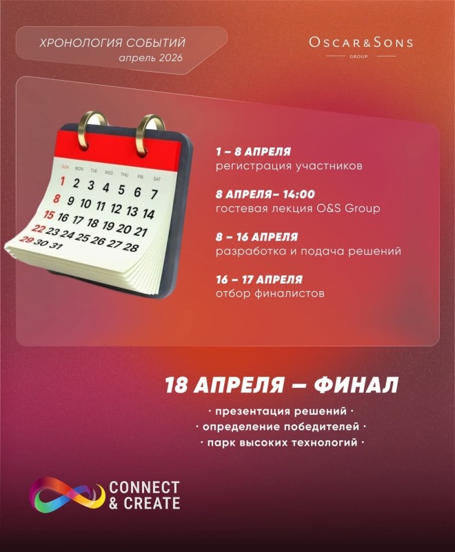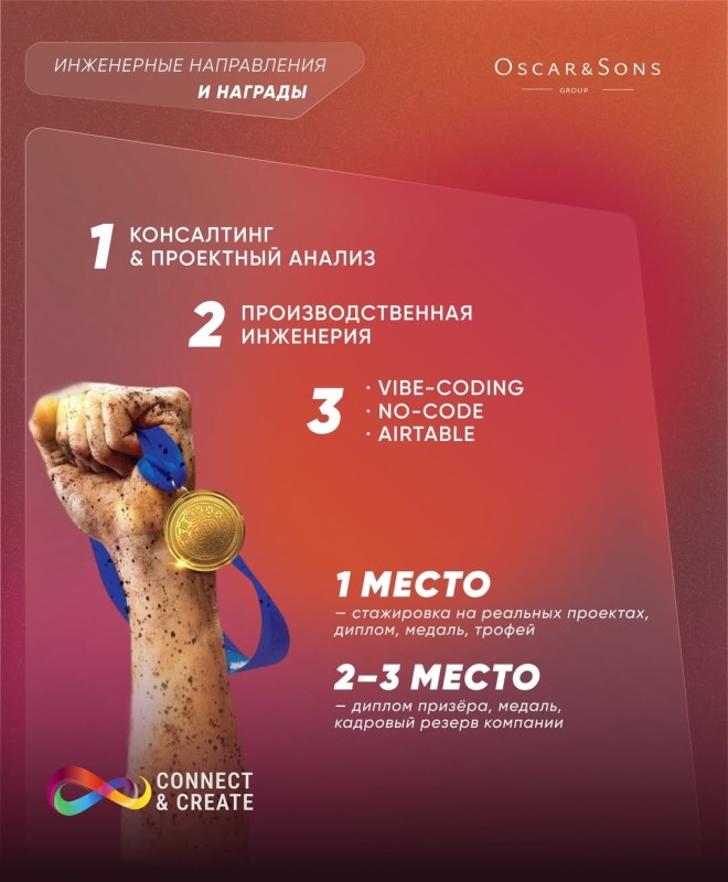 Наша компания Oscar & Sons Group приглашает тебя принять участие в инженерном кейс-чемпионате среди бакалавров и магистрантов “Oscar’s Sons Cup: Engineering & Consulting” в рамках фестиваля Connect & Create 2026.
