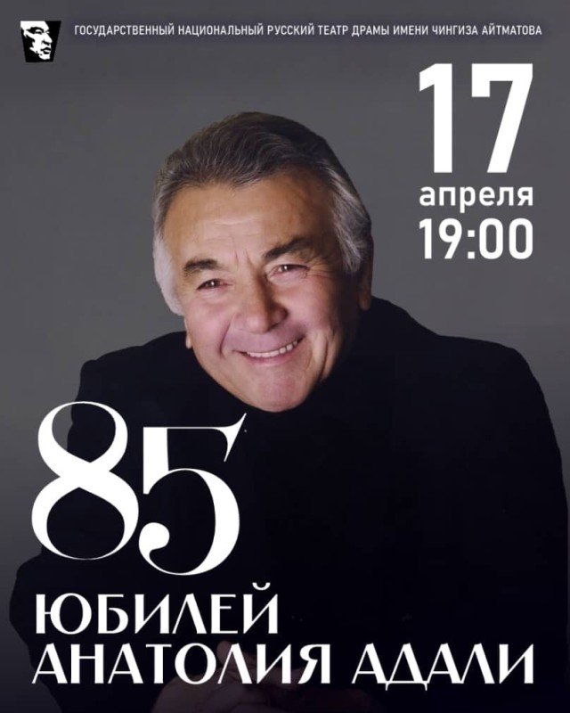 17 апреля ч. им.Ч. Айтматова. На сцене Государственного национального русского драматического театра им.Айтматова пройдет торжественный юбилейный вечер, посвященный 85-летию народного артиста Кыргызской Республики Анатолия Адали.