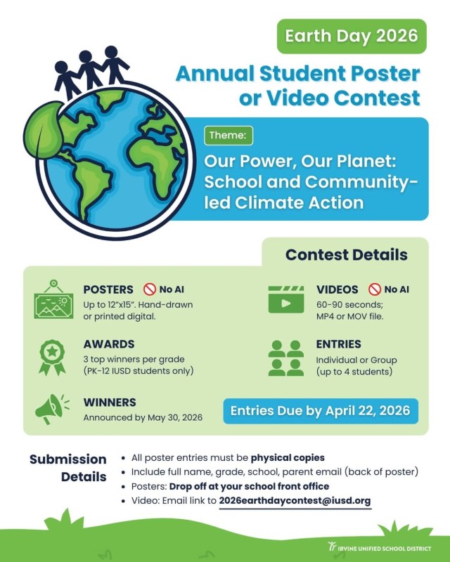 IUSD’s Sustainability Team is accepting entries for the Annual Earth Day Student Poster or Video Contest, which is open to all PK-12 IUSD students. 🌎🌳♻️