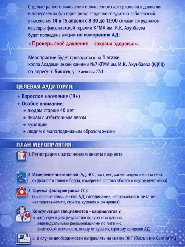 14 и 15 апреля с 08:30 до 12:00 КГМА приглашает жителей столицы принять участие в социальной программе по измерению артериального давления и оценке факторов риска сердечно-сосудистых заболеваний.