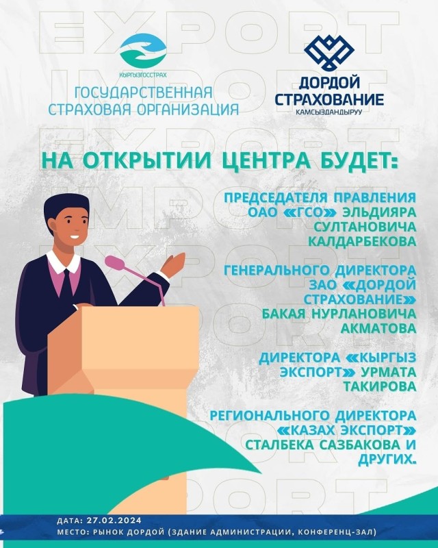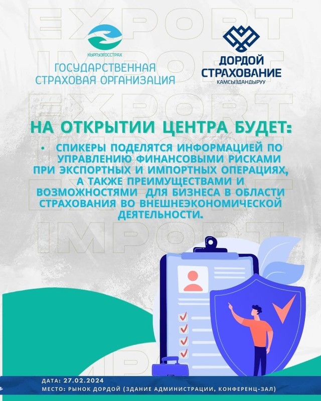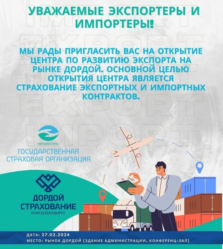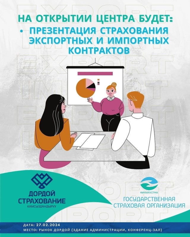 Мы рады пригласить вас на открытие Центра по развитию экспорта на рынке Дордой, основная цель которого — страхование экспортных и импортных контрактов.