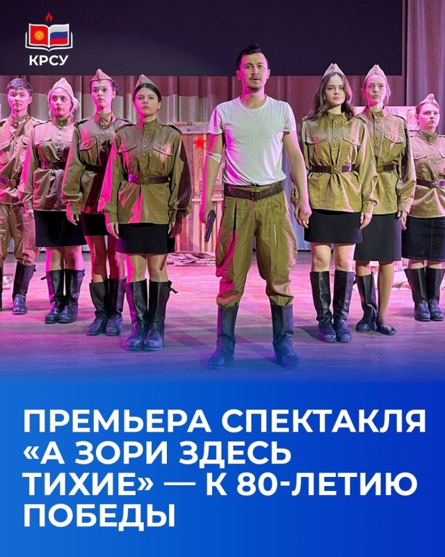16 апреля в 15:00 в Кыргызско-Российском Славянском университете состоится долгожданная премьера спектакля «А зори здесь тихие» по повести Бориса Васильева. Постановка приурочена к 80-летию Великой Победы и подготовлена под руководством режиссёра Анны Шмыриной.