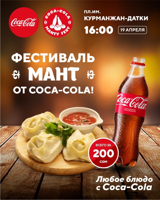 На фестивале вы сможете насладиться несколькими видами мант и другими национальными блюдами вместе с Coca-Cola ВСЕГО ЗА 200 СОМОВ!