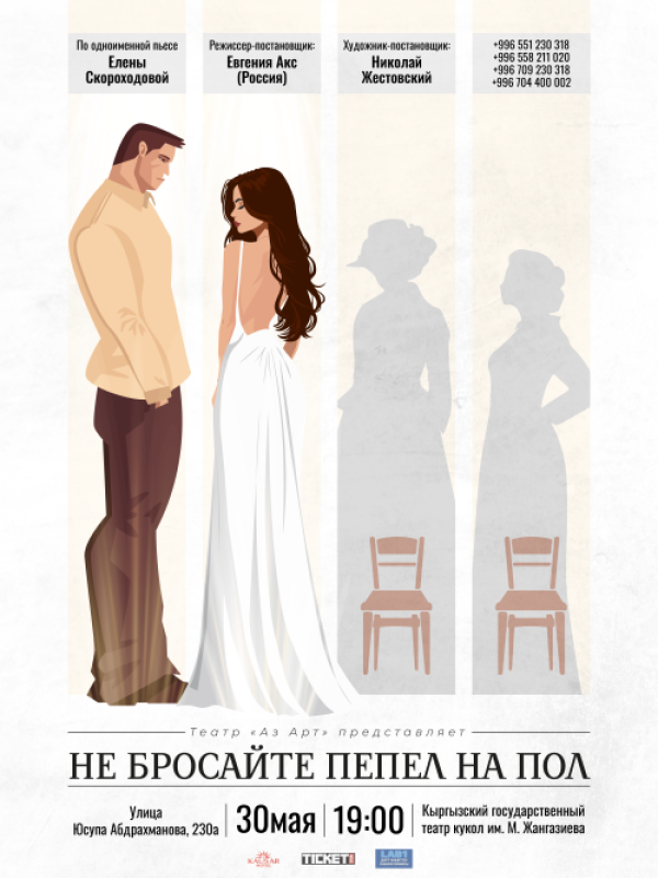 Дорогие друзья, приглашаем Вас на премьеру спектакля «Не бросайте пепел на пол» — пьеса современного российского драматурга Елены Скороходовой, в которой органично переплелись драматизм и комедийность, философская глубина и неожиданные повороты сюжета. В центре истории — встреча успешного столичного бизнесмена и странной местной жительницы в заброшенном поселке российской провинции. Эта неожиданная встреча кардинально меняет жизнь обоих героев, заставляя их переосмыслить свои ценности и взгляды на счастье. Пьеса поднимает вечные вопросы о смысле жизни, любви и путях достижения счастья, сочетая напряженные драматические моменты с комическими ситуациями и философскими размышлениями.