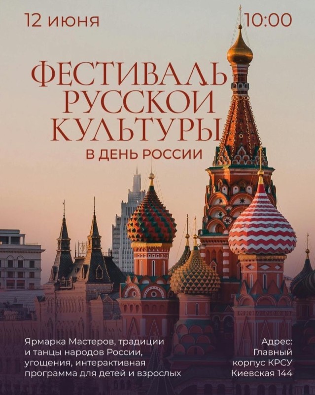 🗓 12 июня в 10:00 в Кыргызско-Российском Славянском Университете состоится культурно-творческое мероприятие — «Фестиваль русской культуры», приуроченное ко Дню России.