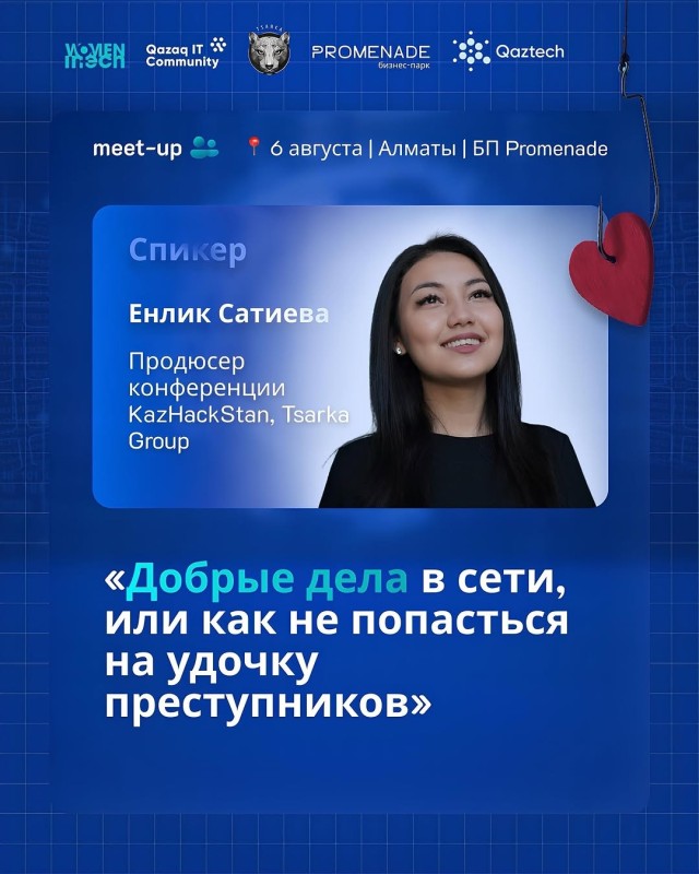 6 августа в Алматы состоится митап «Добрые дела в сети, или как не попасться на удочку преступников» — честный разговор о том, как технологии могут помогать, а не вредить.