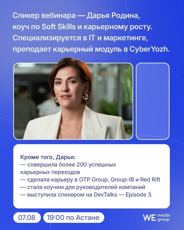 Спикер вебинара — Дарья Родина, коуч по Soft Skills и карьерному росту. Специализируется в IT и маркетинге, преподает карьерный модуль в CyberYozh.