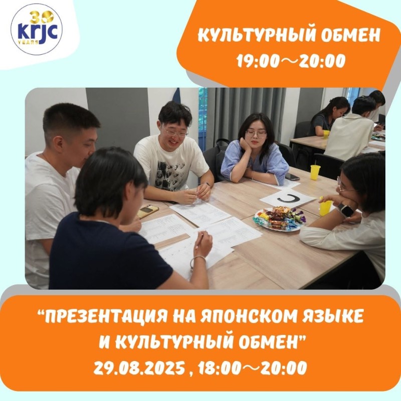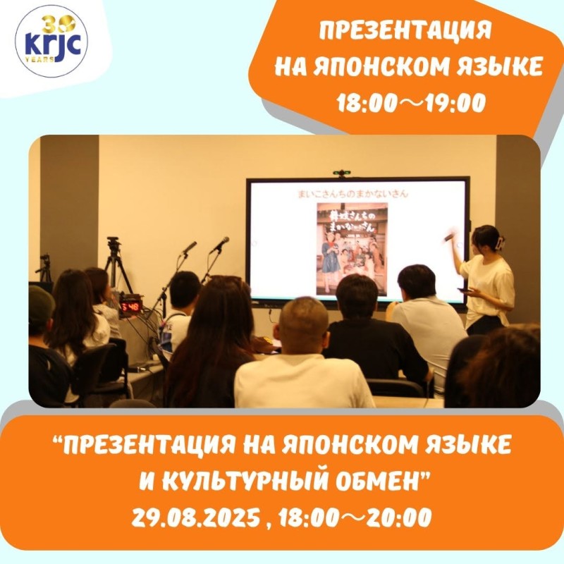 Дорогие друзья! Приглашаем вас на мероприятие «Презентация на японском языке и культурный обмен», которое пройдёт в KRJC. Принять участие может каждый, кто изучает японский язык — вне зависимости от возраста и уровня владения. Это отличная возможность попрактиковать язык, весело и с пользой провести время, познакомиться с новыми людьми и пообщаться с носителями. Тема презентации — «Мой город». Участники смогут рассказать о своём родном городе, поделиться интересными историями, местной культурой и традициями на японском языке.