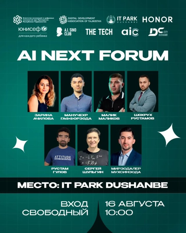 💥16 августа в IT PARK Dushanbe состоится AI NEXT FORUM — первый в истории Таджикистана форум, посвященный искусственному интеллекту. Участников ждут выступления практиков и экспертов, панельные дискуссии, мастер-классы, обсуждение мировых трендов и вызовов, а также нетворкинг с ведущими специалистами отрасли.