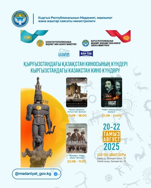 Урматтуу Бишкек шаарынын тургундары жана коноктору, 20–22-август күндөрү Бишкек шаарындагы “Ала Тоо” кинотеатрында Казакстандын Кыргызстандагы кино күндөрү өтөт. Иш-чаранын алкагында казакстандык белгилүү режиссёрлордун көркөм тасмалары көрсөтүлүп, ар бир киносеанстан кийин авторлор менен жандуу талкуу уюштурулат.