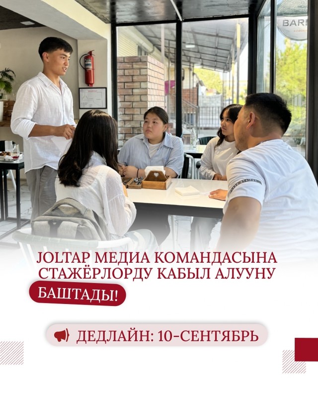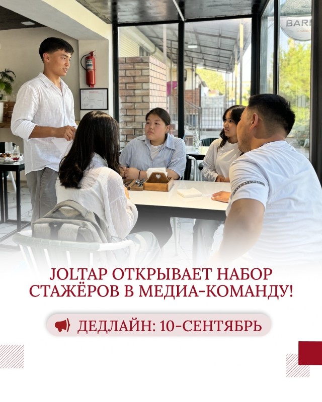 📣Joltap медиа-командасына стажёрлорду кабыл алууну баштады. Биз чыгармачыл жана жоопкерчиликтүү адамдарды издейбиз. Эгер сен медиа тармагында өнүгүүнү жана биздин командага кошулууну кааласаң анда мүмкүнчүлүктү колдон чыгарба!