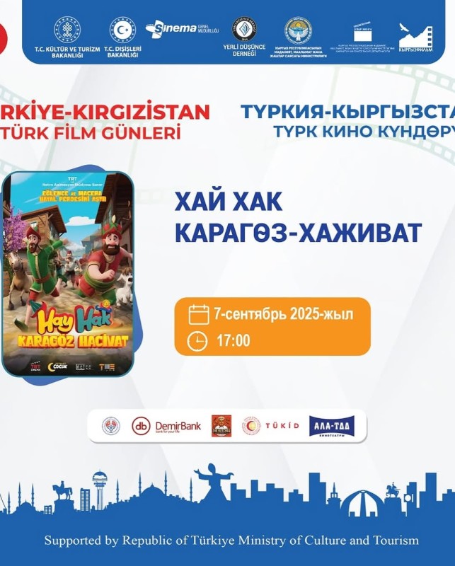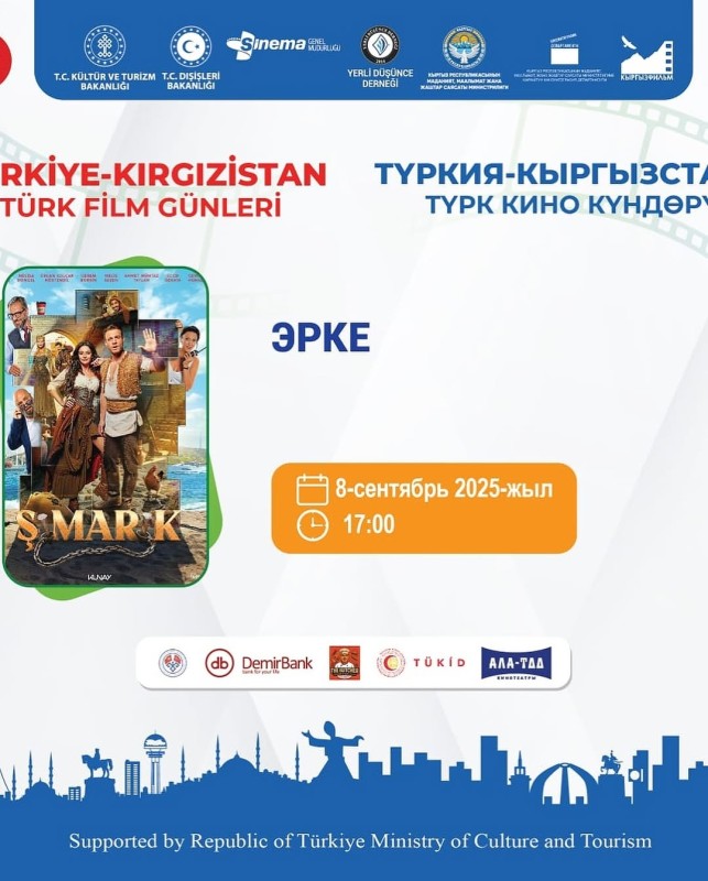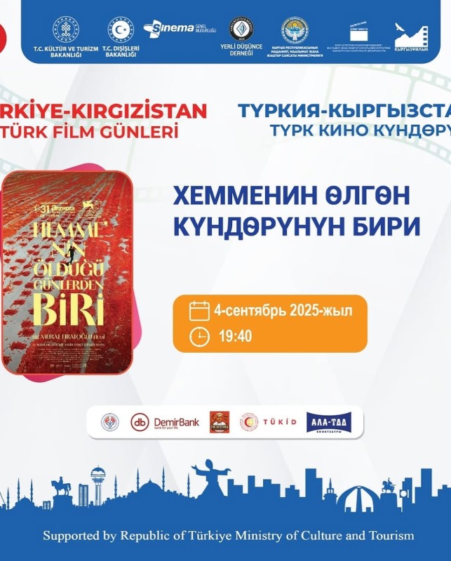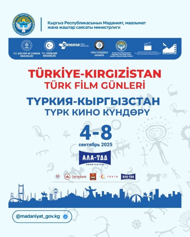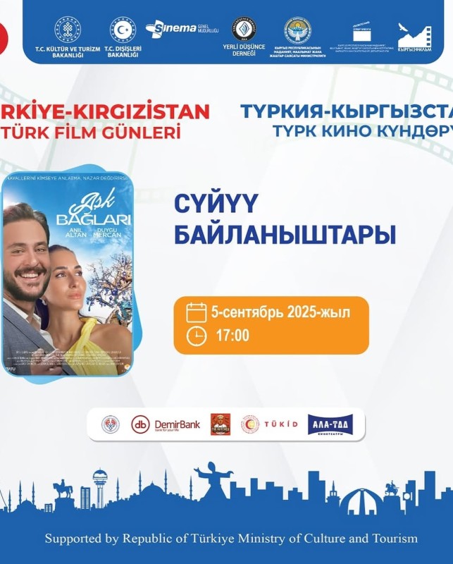 В Бишкеке с 4 по 8 сентября 2025 года пройдут Дни турецкого кино «Турция-Кыргызстан», направленные на укрепление культурных связей между Турцией и Кыргызстаном и продвижение турецкого кино.