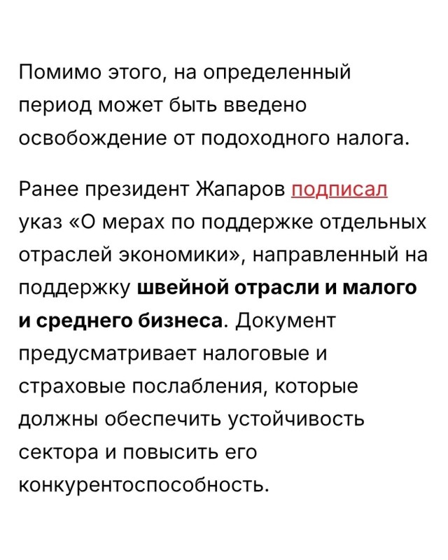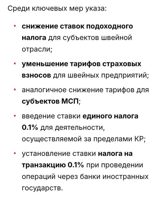 — В Кыргызстане готовится законопроект, который введет единые условия для всех категорий швейных предприятий. О деталях новой инициативы сообщил зампредседателя Государственной налоговой службы Кубанычбек Ысабеков в эфире Ала-Тоо LIVE.