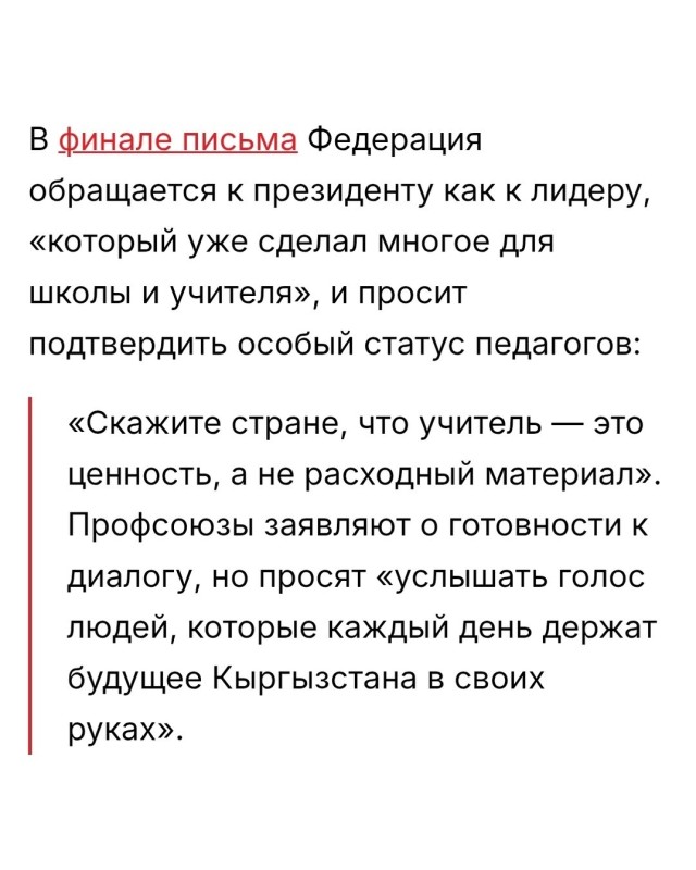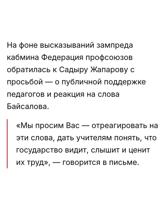 — Федерация профессиональных союзов КР, объединяющая более 184 тысяч работников образования, направила президенту Садыру Жапарову открытое обращение на фоне недавних высказываний зампредседателя кабмина Эдиля Байсалова. Свое письмо федерация именует «криком о помощи от всего педагогического сообщества Кыргызстана».