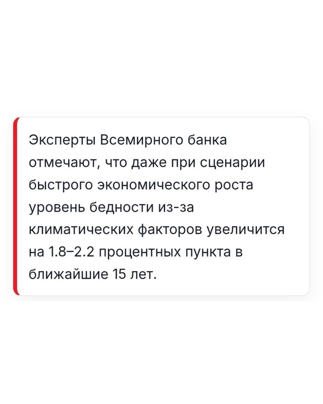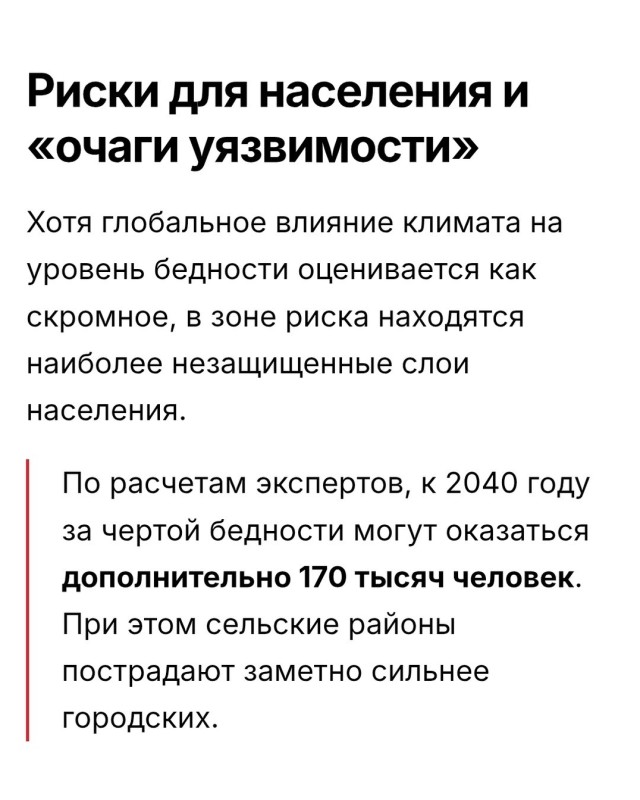 Аналитики прогнозируют, что к 2040 году экономика потеряет около 2–3% потенциального роста, а к середине века разрыв увеличится до 4%. Основной удар придется на сельское хозяйство и инфраструктурные отрасли. Это создает прямые угрозы для продовольственной безопасности страны и транспортной связности регионов.