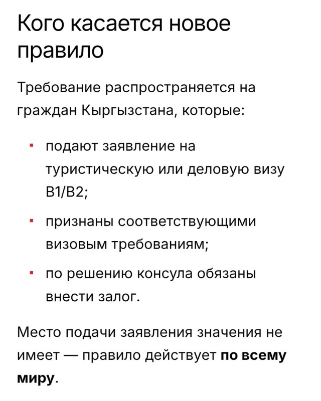 — С 21 января 2026 года граждане Кыргызстана, получающие туристические и деловые визы в США категории B1/B2, будут подпадать под новое требование — обязательный визовый залог. Кыргызстан включен в перечень стран, для которых США запускают пилотную программу visa bond. Решение принято Государственным департаментом США в рамках борьбы с превышением сроков пребывания по визам. Информация о новых правилах размещена на сайте Госдепартамента.