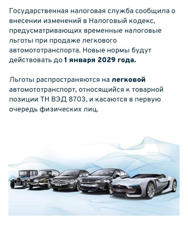 Государственная налоговая служба сообщила о внесении изменений в Налоговый кодекс, предусматривающих временные налоговые льготы при продаже легкового автомототранспорта. Новые нормы будут действовать до 1 января 2029 года.