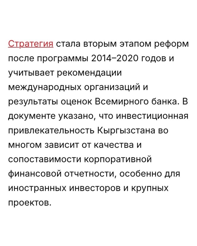 — Кабмин утвердил Стратегию развития корпоративной финансовой отчетности и аудита в Кыргызстане на 2026–2030 годы, а также план мероприятий по ее реализации. Как разъяснили в Госфиннадзоре, документ определяет, как в ближайшие пять лет будет меняться система бухгалтерского учета, аудита и раскрытия финансовой информации, от которой напрямую зависит доверие инвесторов и деловая репутация страны.