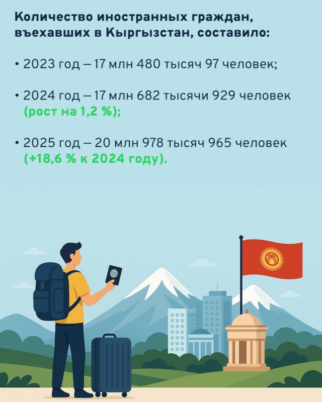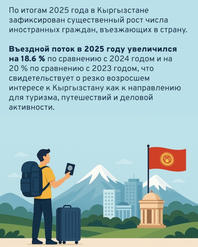 Въездной поток в 2025 году увеличился на 18.6 % по сравнению с 2024 годом и на 20 % по сравнению с 2023 годом, что свидетельствует о резко возросшем интересе к Кыргызстану как к направлению для туризма, путешествий и деловой активности.