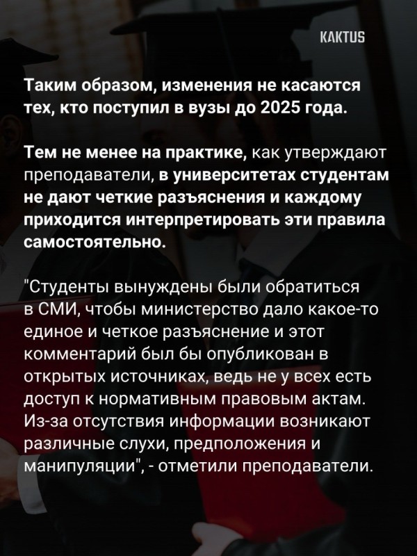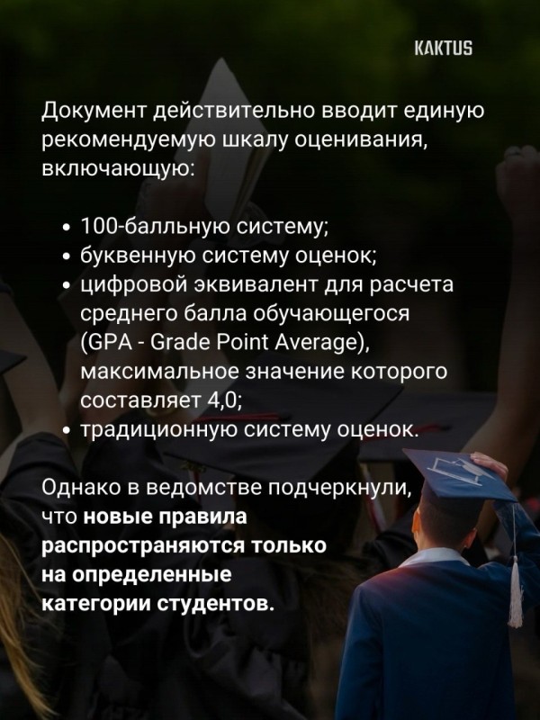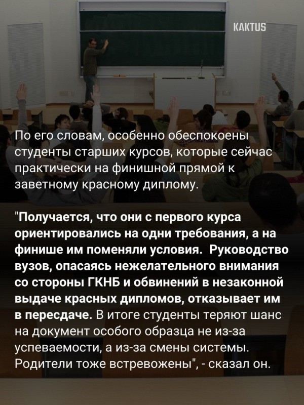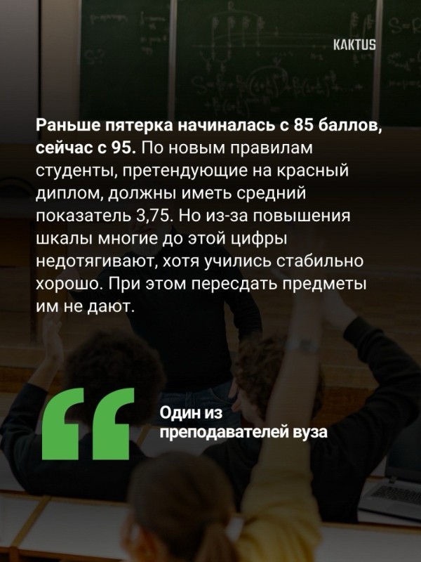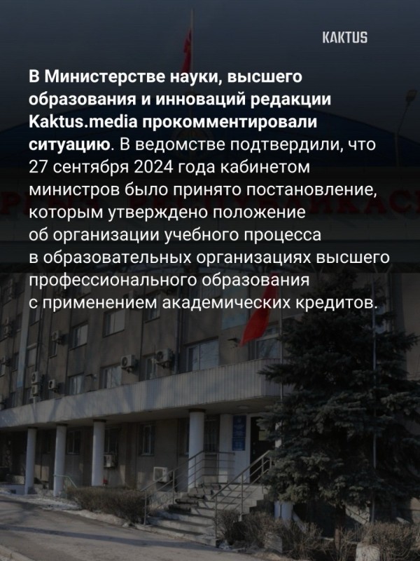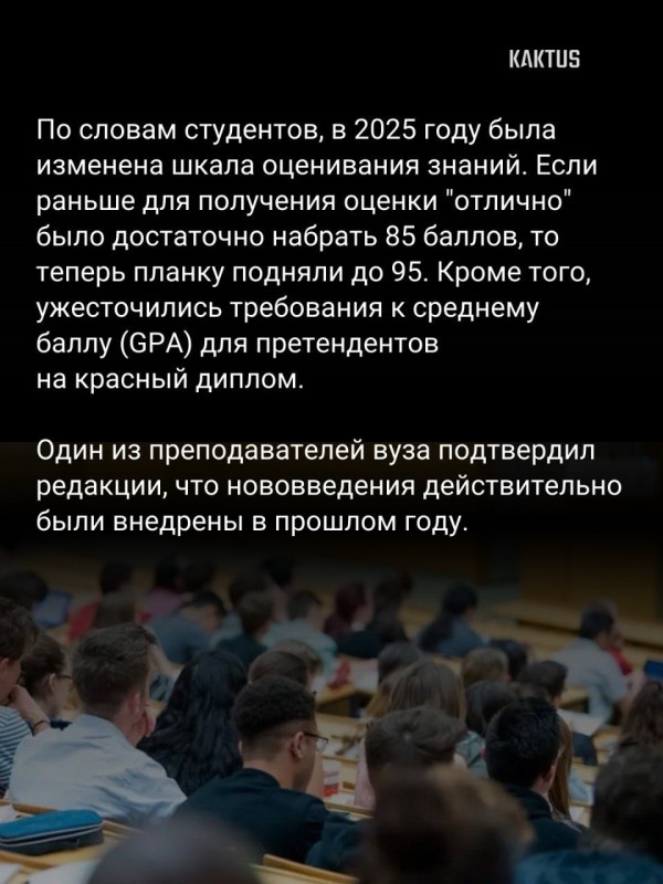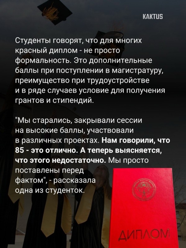 В редакцию Kaktus.media обратились студенты одного из вузов Бишкека. Они рассказали, что Министерство науки, высшего образования и инноваций изменило систему оценивания в вузах. Студенты опасаются, что из-за этого могут лишиться красных дипломов, несмотря на то, что к этому результату шли с первого курса. Подробнее - в карусели 👆