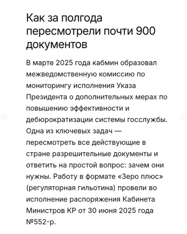 — В Кыргызстане редко происходят реформы, которые затрагивают бизнес настолько напрямую. Без громких лозунгов, но с очень конкретным эффектом: меньше справок, меньше хождений по кабинетам, меньше «бумажных матрешек», в которых один разрешительный документ прячется внутри другого. Речь идет о масштабной реформе лицензионно-разрешительной системы, получившей название «Зеро плюс» (Zero Plus). По сути, это регуляторная гильотина: быстрый и жесткий пересмотр почти 900 разрешительных документов всего за шесть месяцев.