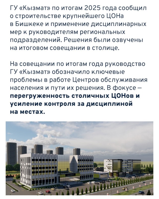 ГУ «Кызмат» по итогам 2025 года сообщил о строительстве крупнейшего ЦОНа в Бишкеке и применение дисциплинарных мер к руководителям региональных подразделений. Решения были озвучены на итоговом совещании в столице.