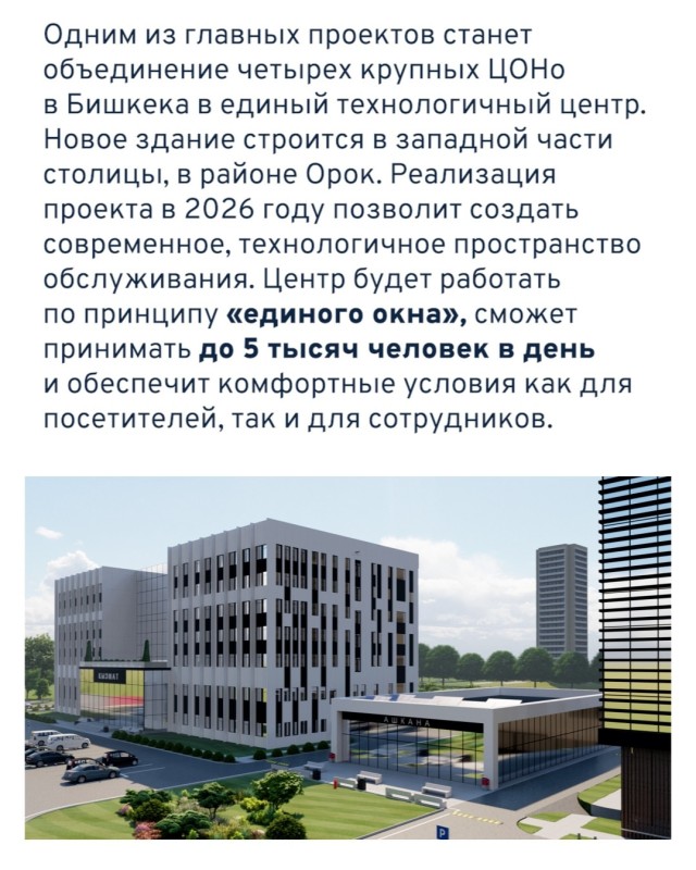 Одним из главных проектов станет объединение четырех крупных ЦОНов Бишкека в единый технологичный центр. Новое здание строится в западной части столицы, в районе Орок. Реализация проекта в 2026 году позволит создать современное, технологичное пространство обслуживания. Центр будет работать по принципу «единого окна», сможет принимать до 5 тысяч человек в день и обеспечит комфортные условия как для посетителей, так и для сотрудников.