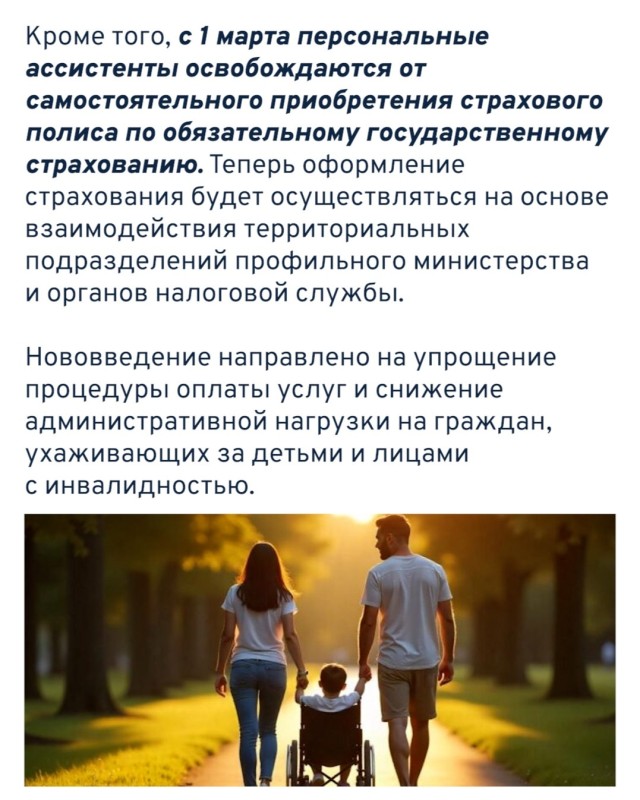 Кроме того, с 1 марта персональные ассистенты освобождаются от самостоятельного приобретения страхового полиса по обязательному государственному страхованию. Теперь оформление страхования будет осуществляться на основе взаимодействия территориальных подразделений профильного министерства и органов налоговой службы.