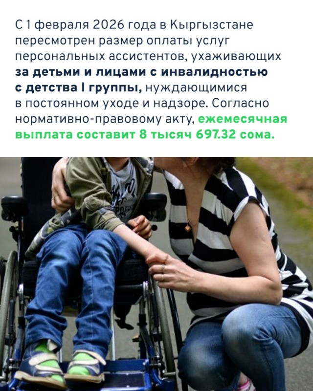 С 1 февраля 2026 года в Кыргызстане пересмотрен размер оплаты услуг персональных ассистентов, ухаживающих за детьми и лицами с инвалидностью с детства I группы, нуждающимися в постоянном уходе и надзоре. Согласно нормативно-правовому акту, ежемесячная выплата составит 8 тысяч 697.32 сома.