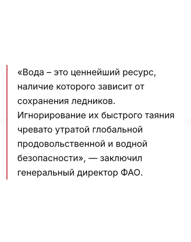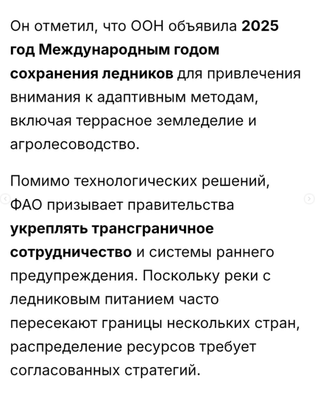 — Генеральный директор Продовольственной и сельскохозяйственной организации ООН (ФАО) Цюй Дунъюй в авторской статье предупредил о критическом сокращении мировых запасов воды из-за таяния ледников и выделил опыт Кыргызстана по созданию ледяных башен в Баткене как эффективный метод адаптации.
