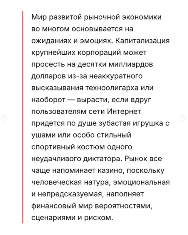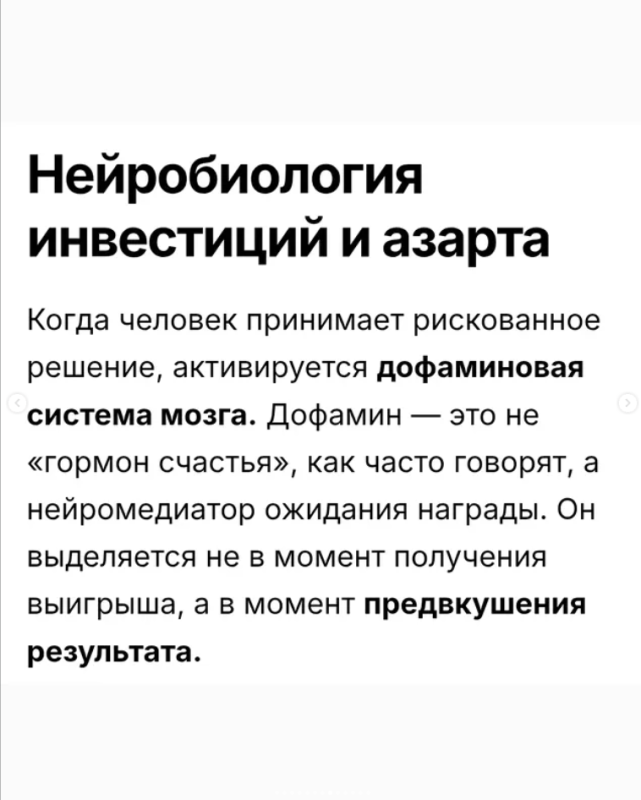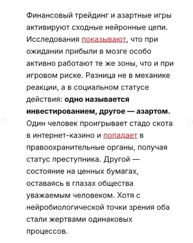 Однако если из истории про ценные бумаги вымести все атрибуты успешного успеха и киношные штампы, мы получим главный компонент, который движет теми, кто играет в большие и маленькие деньги. Риск. А риск — это не только экономическое понятие, но и социально-биологическое.